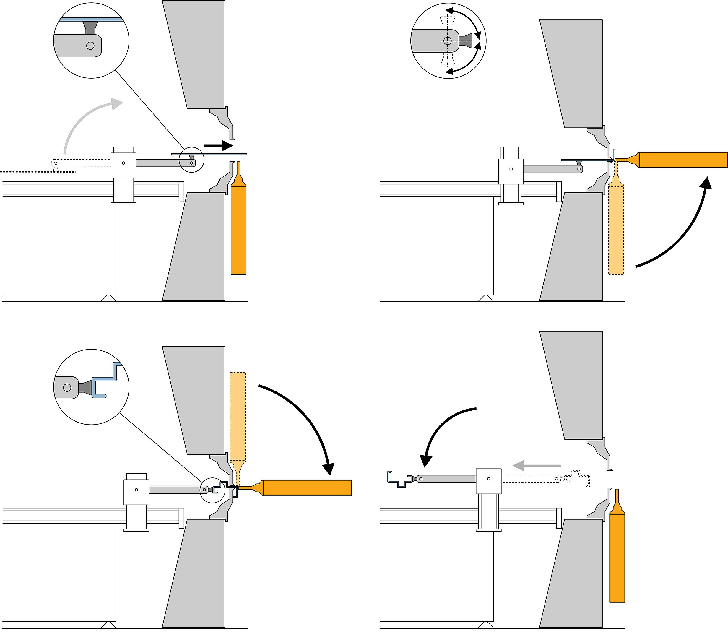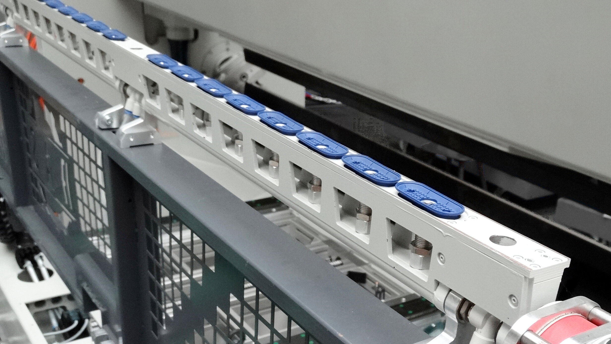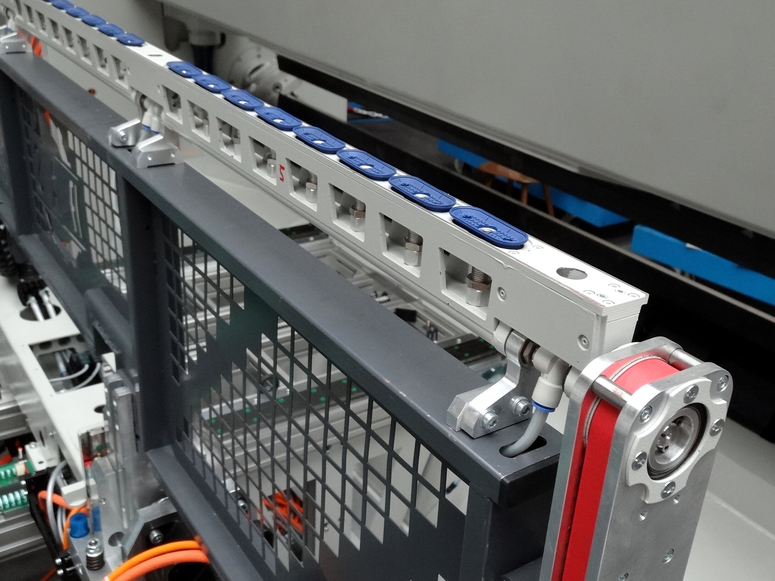 The unique FlexGripper Positioning System moves, rotates and flips the blank automatically during the folding process. Its multi-flexible suction frame grips the part with up to forty suction cups. The vacuum is generated by an on-board vacuum pump. The suction bar can grab the blank from below, from above or from behind and can automatically change its access position during the folding sequence.