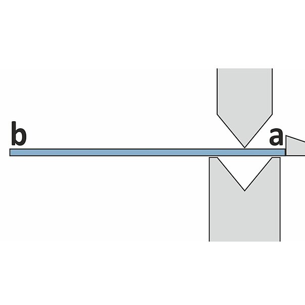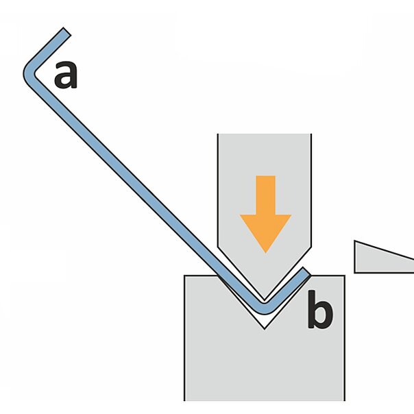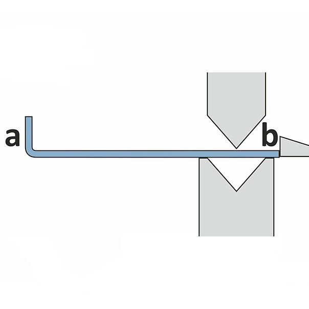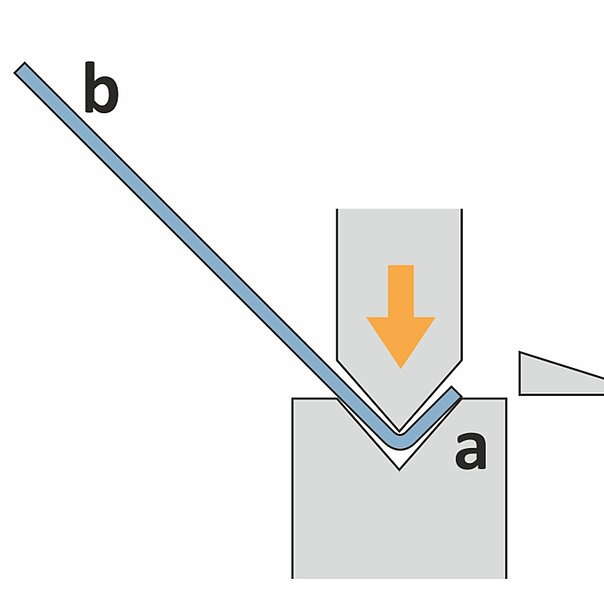 Beim Gesenkbiegen wird üblicherweise der kurze Schenkel angeschlagen. Der lange Schenkel ragt aus der Maschine.