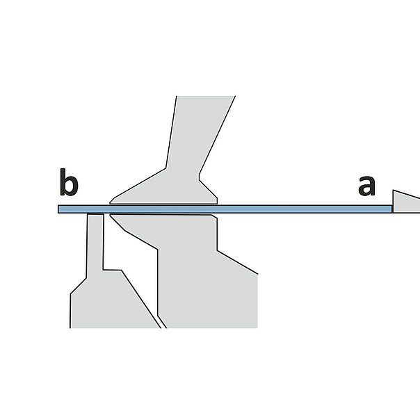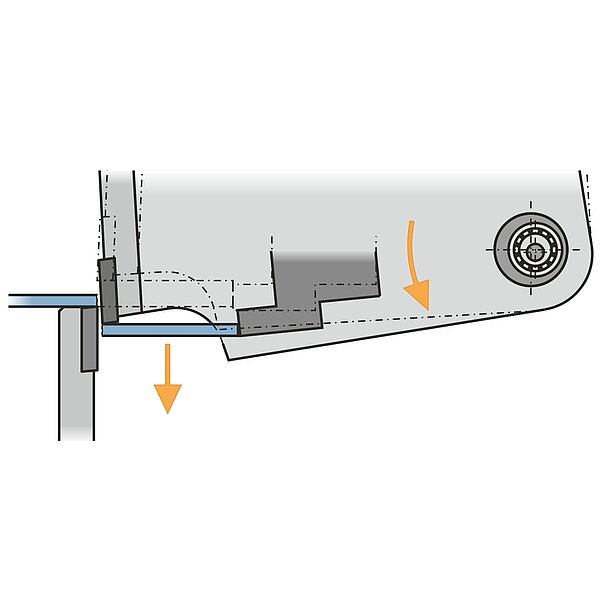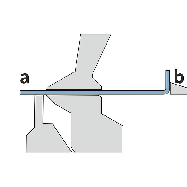 Beim Schwenkbiegen liegt die gesamte Platine in der Maschine. Lediglich ein kurzer Blechschenkel ragt zwischen Ober- und Unterwange heraus.