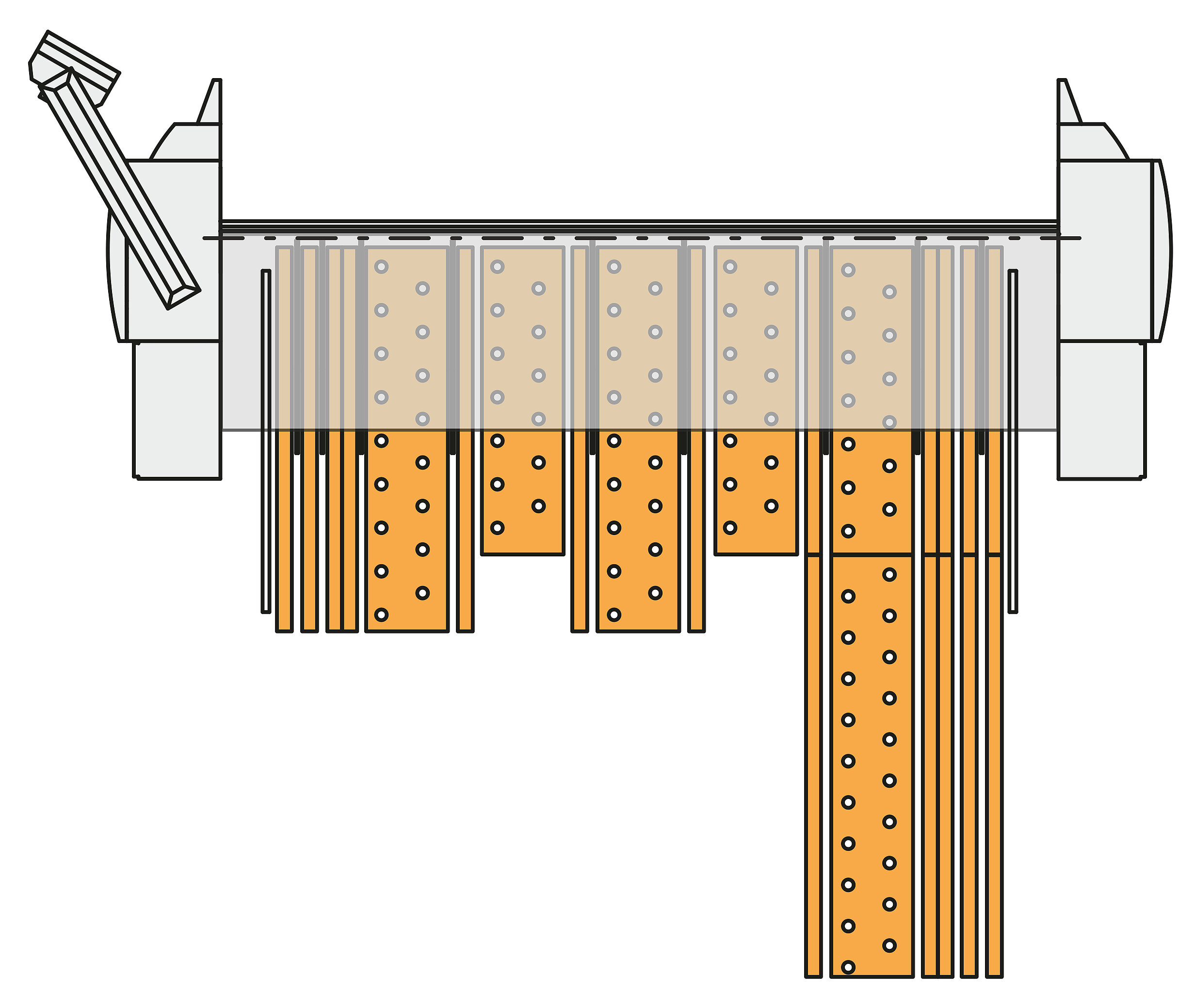 Die Werkzeuge der Oberwange, Biegewange und Unterwange sind segmentiert. Die vorne-frei oder hinten-frei Geometrien bieten viel Platz für lange C-Schenkel oder schmale Bauteile. Unterschiedliche Werkzeughöhen und Formen decken die Vielfalt der Biegeaufgaben ab. Bei gezielter Teileanalyse reicht jedoch oft ein einziger Werkzeugsatz für das gesamte Teilespektrum.