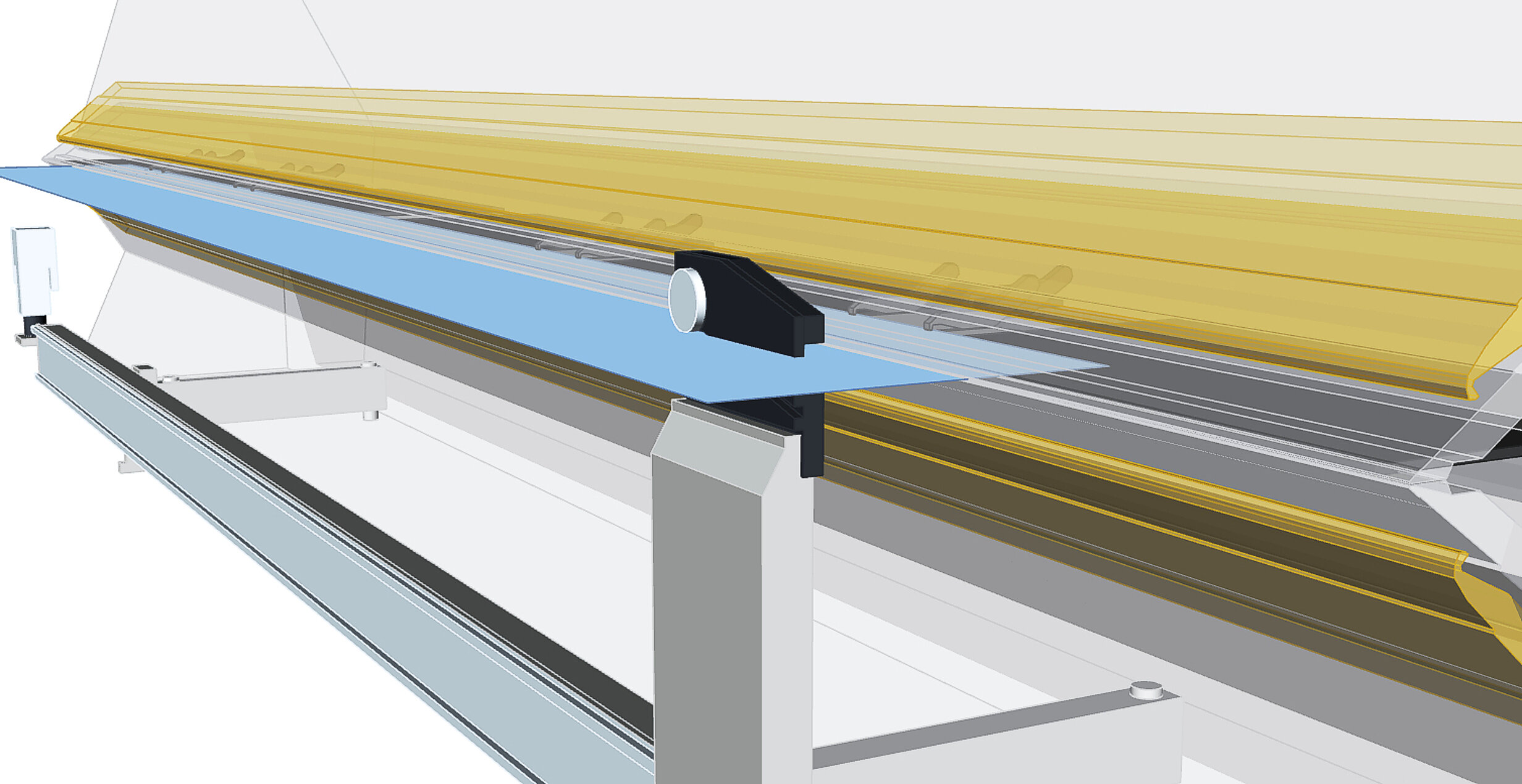 Wird das CutModul angewählt, zeigt die Software an welcher Stelle der Bediener den Materialstreifen einlegen soll. Das XXL-Center zieht das Blech automatisch ein, richtet es aus und positioniert es auf Maß. Die Oberwange spannt den Materialstreifen und die rechts an der Maschine angeordnete Schneideinheit schneidet das Werkstück auf das eingegebene Maß.
