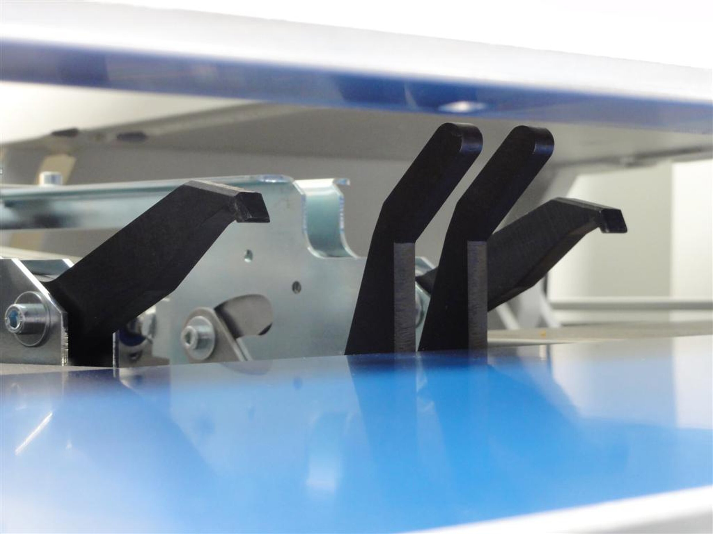 Die trichterförmigen Anschlagfinger tauchen aus der Arbeitsfläche auf und richten die Zuschnitte automatisch aus.