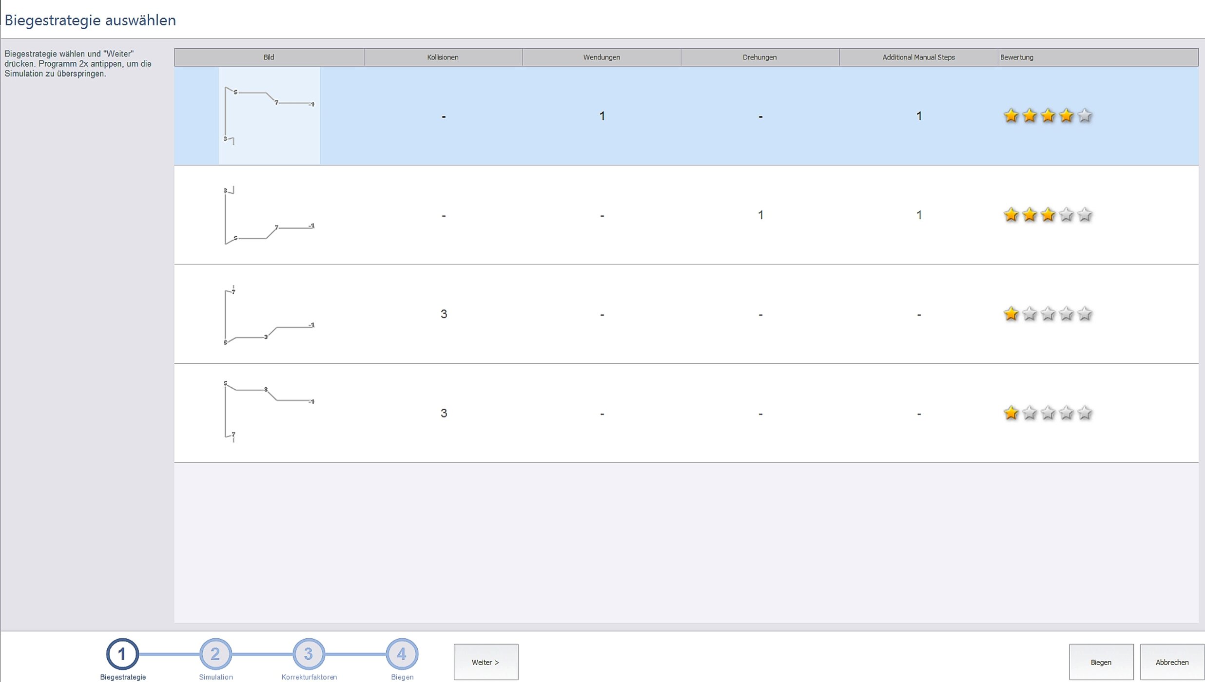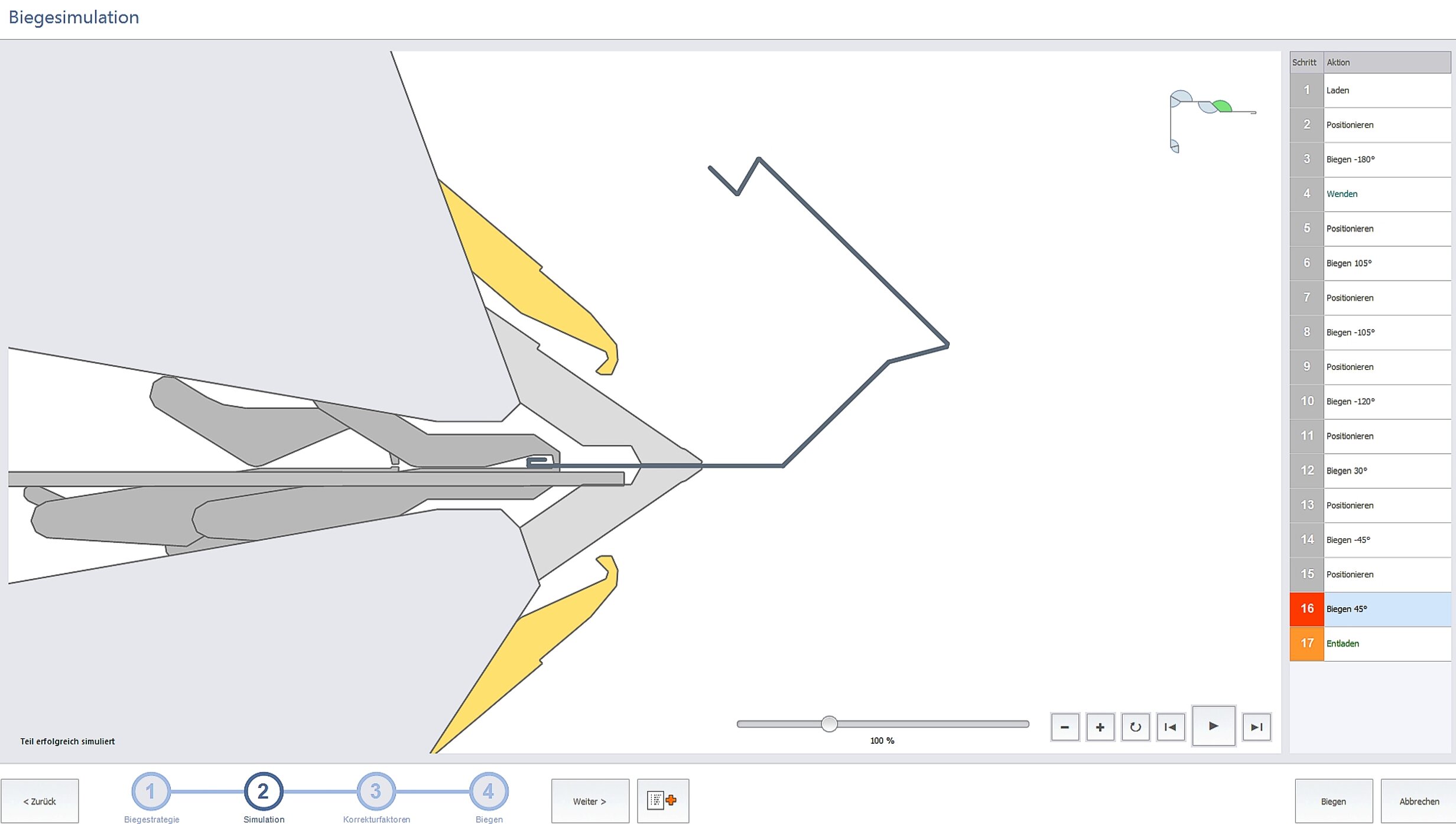 Der Bediener zeichnet das Profil auf dem Touch-Monitor oder mit der Office-Software im Büro. Die Bendex-Software programmiert das Biegeteil automatisch und schlägt die beste Biegestrategien vor. Die Software simuliert den gesamten Programmablauf wahlweise in einer 2D oder 3D.