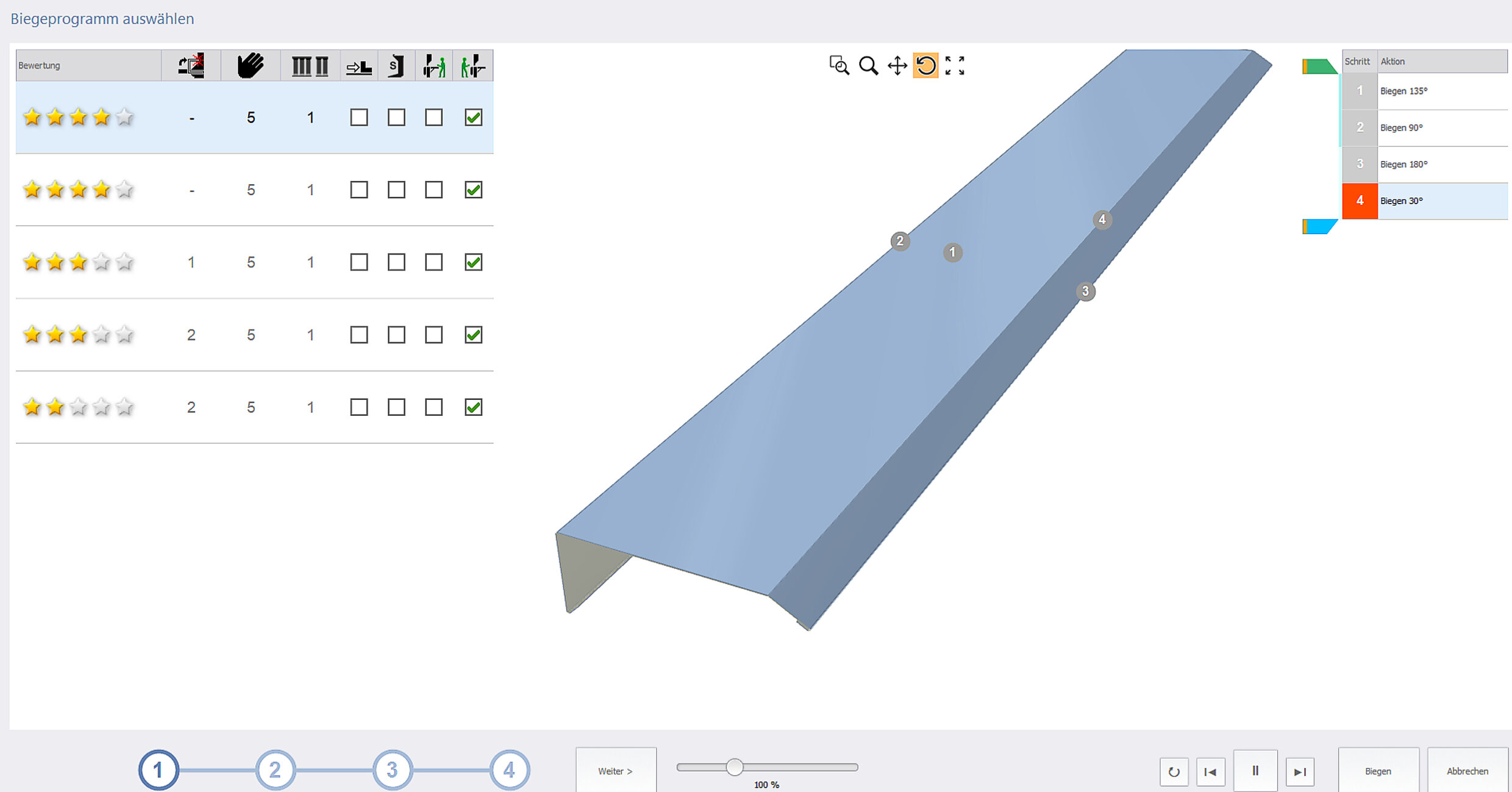 In der OpenEditor Programmierung übernimmt der Bediener vollständig das Ruder und legt durch seine Eingaben die Reihenfolge der Biegungen fest. Damit können Spezialisten exakt die für sie vertrauten Abläufe programmieren.