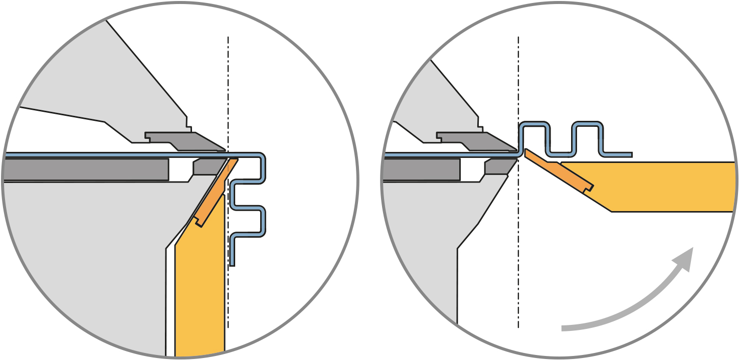 The new XXL folding beam provides extended free space of up to 5 mm behind the bending line, allowing increased flexibility when forming complex part geometries. In this configuration, sheet thicknesses of up to 2.0 mm can be processed.