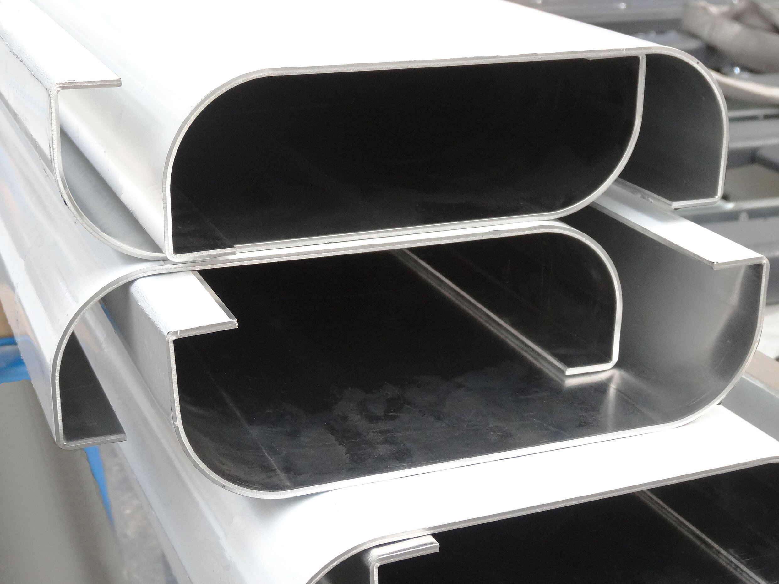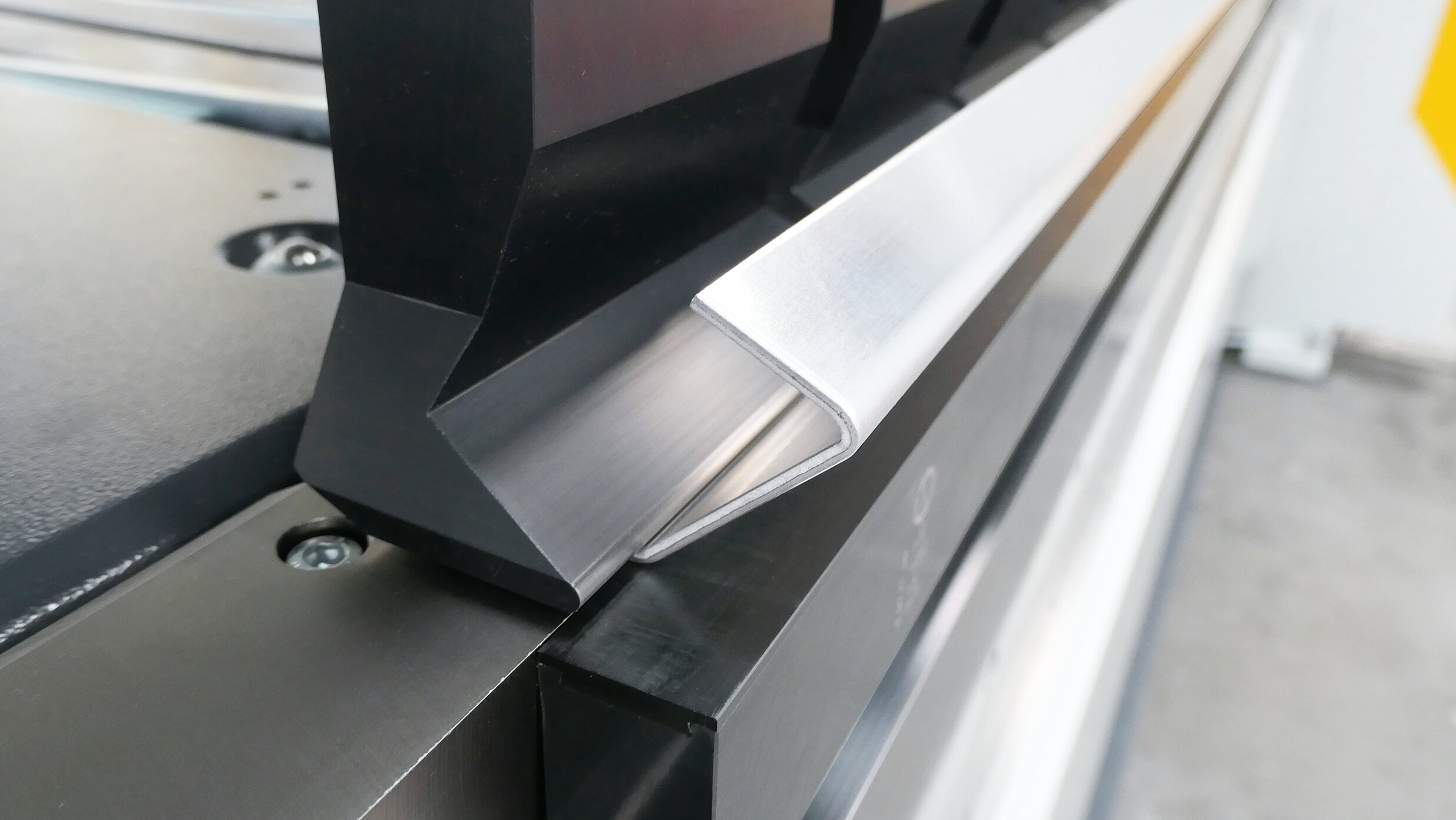 Beim Biegen von Radiusteilen aus 3–4 mm Aluminium lassen sich auf der RAS GIGAbend hervorragende Resultate erzielen. Exakte und wiederholgenaue Radien über die gesamte Biegelänge und eine oberflächenschonende Umformung zeichnet sich das Schwenkbiegen für optisch anspruchsvolle Radiusteile aus. Mit Hilfe der Adapteraufnahmen kann sich der Kunde jedes gewünschte Radiuswerkzeug selbst fertigen und das Einsatzspektrum der Maschine kostengünstig erweitern.