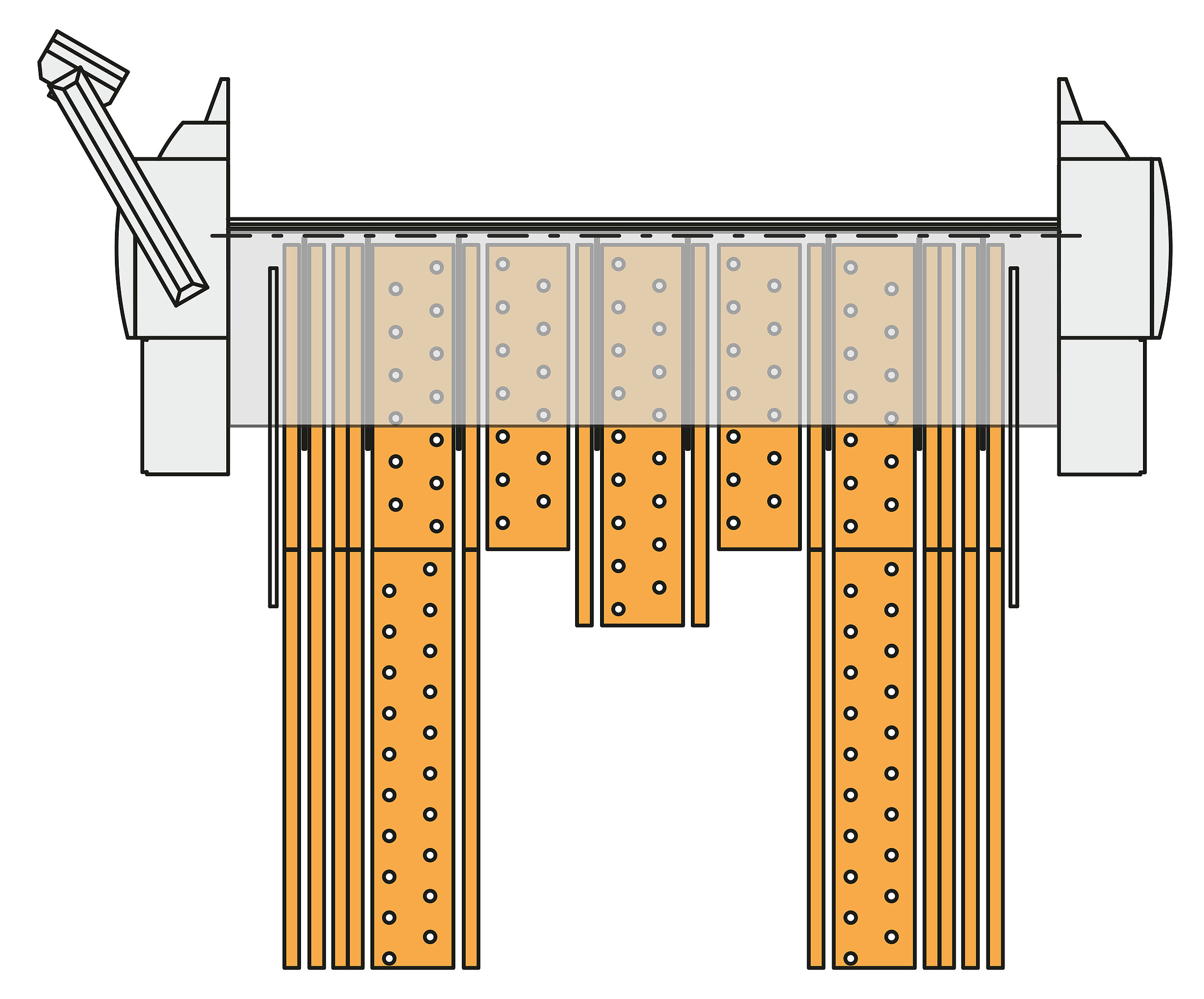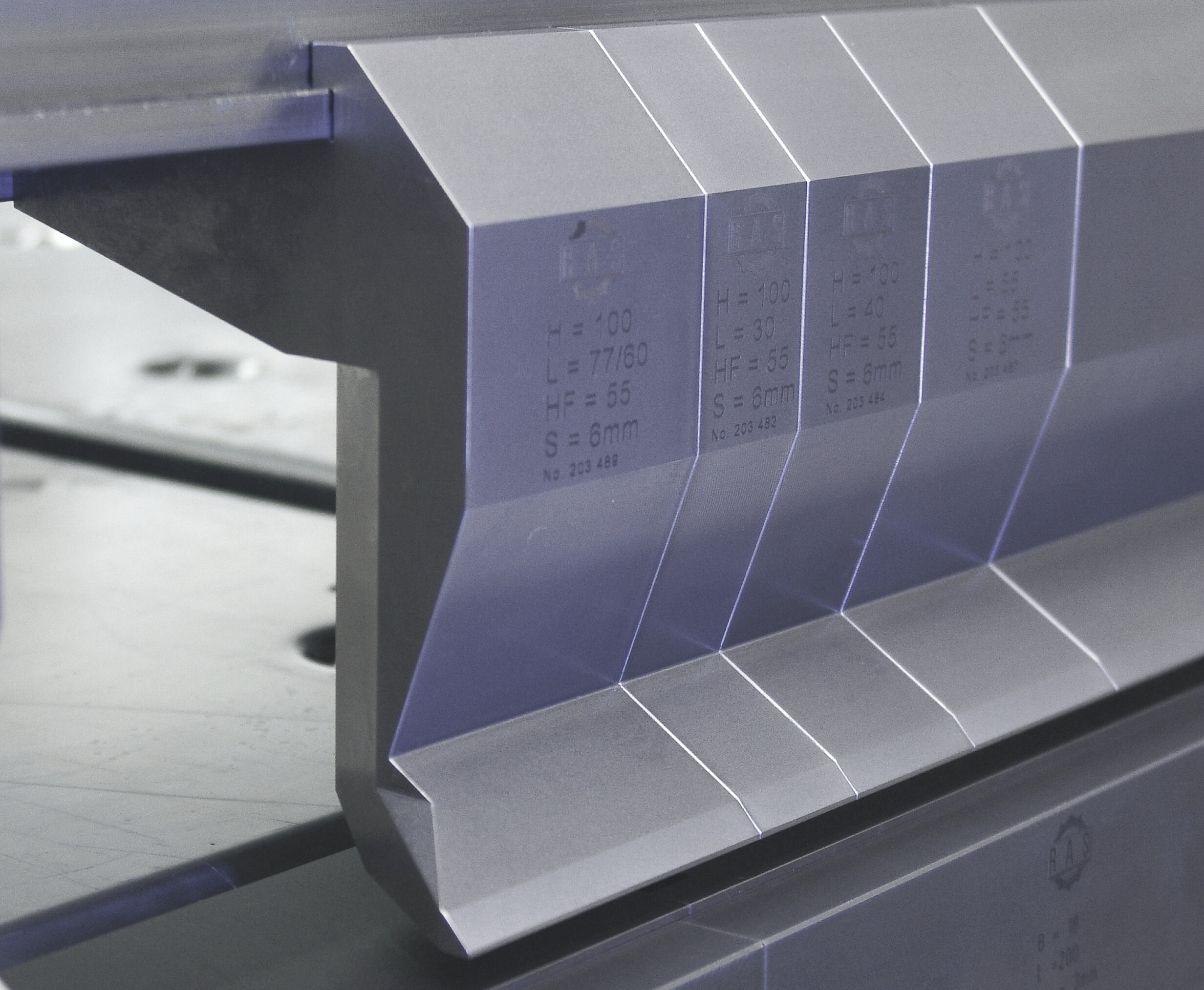 Die Werkzeuge der Oberwange, Biegewange und Unterwange sind segmentiert. Die vorne-frei oder hinten-frei Geometrien bieten viel Platz für lange C-Schenkel oder schmale Bauteile. Unterschiedliche Werkzeughöhen und Formen decken die Vielfalt der Biegeaufgaben ab. Bei gezielter Teileanalyse reicht jedoch oft ein einziger Werkzeugsatz für das gesamte Teilespektrum.