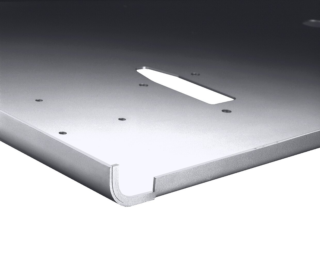 Anders als beim Gesenkbiegen, das meist deutlich sichtbare Druck- und Kratzspuren von den den Matrizenrändern hinterlässt, kann das Schwenkbiegen auch als sanftes Umformen bezeichnet werden. Das macht bei optisch anspruchsvollen Biegeteilen einen erheblichen Qualitätsunterschied aus. Verwendet man beim Schwenkbiegen allerdings Oberwangen-Werkzeugen mit einem Radius anstelle einer Werkzeugspitze, verlängert sich auch hier die Gleitstecke des Biegewangenwerkzeugs auf der Materialoberfläche. Biegewangenwerkzeuge mit Kunststoffeinsatz vermeiden in solchen Anwendungsfällen Druckspuren auf hochwertigen Oberflächen.