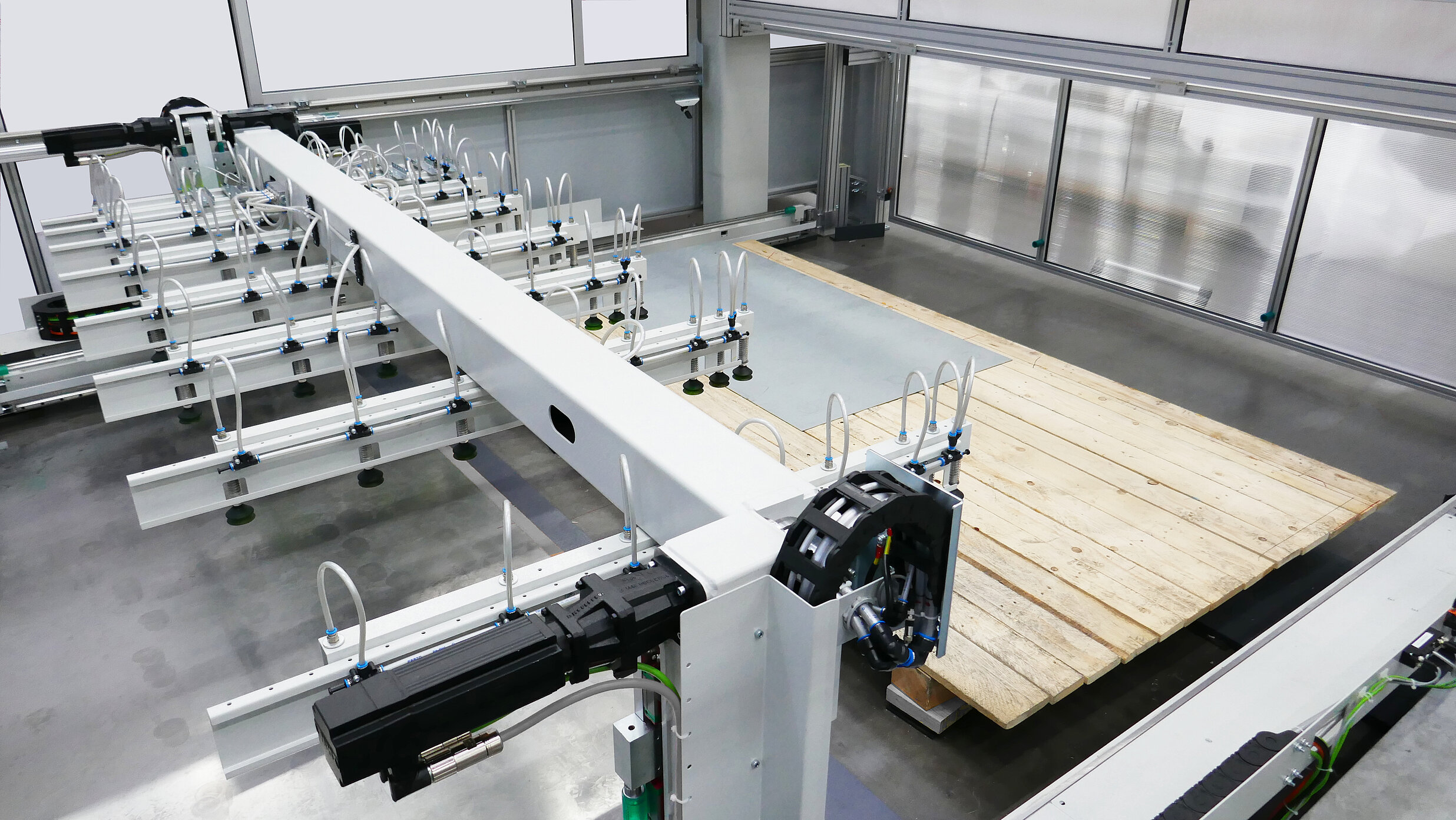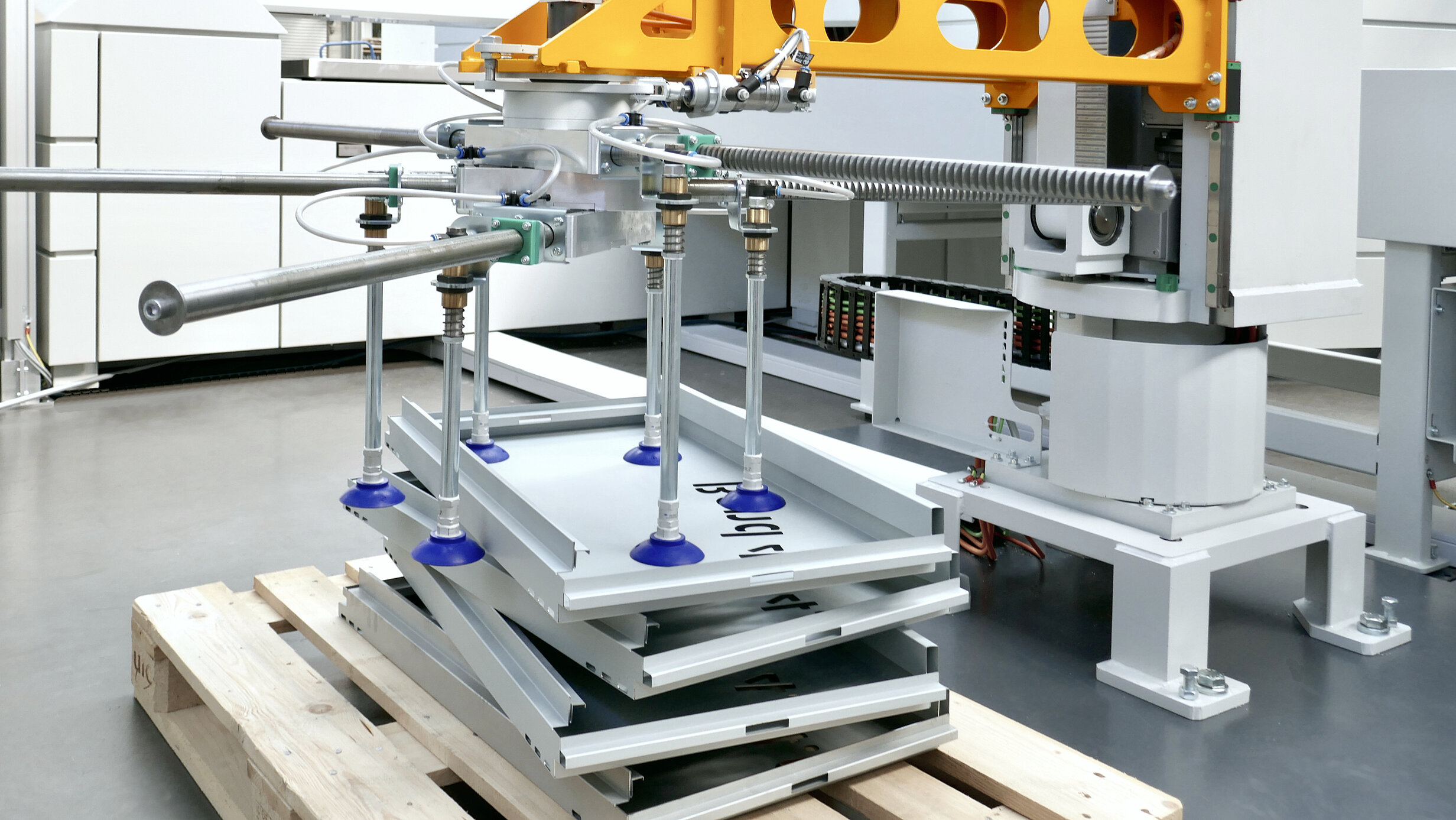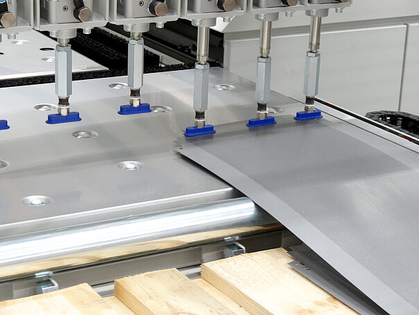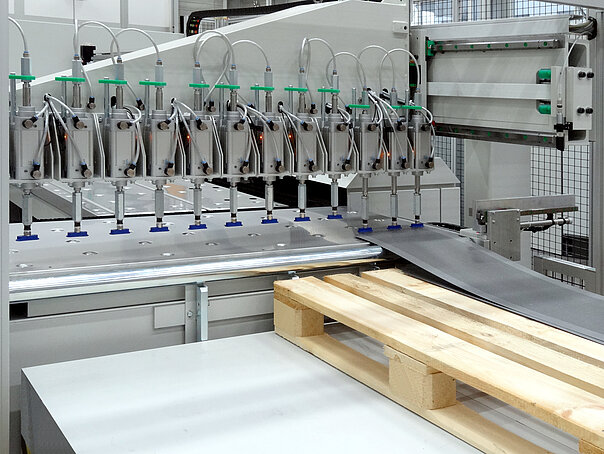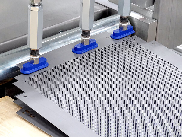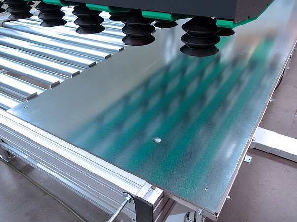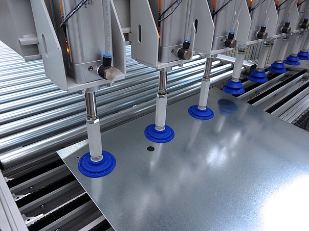 Die federnd gelagerten Sauger können Bleche auch von nicht eben stehenden Paletten beladen. Zudem lassen sich auch Bleche mit leichten Prägungen aufnehmen, die aufgeschüsselt auf einem Stapel liegen.