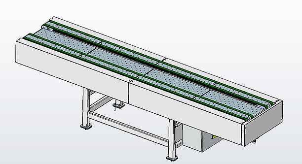 Beim Fertigteil-Bandauslauf sind die 4 Transportbänder exakt mit der Auslaufgeschwindigkeit der fertigen Biegeteile aus dem Multibend-Center synchronisiert.