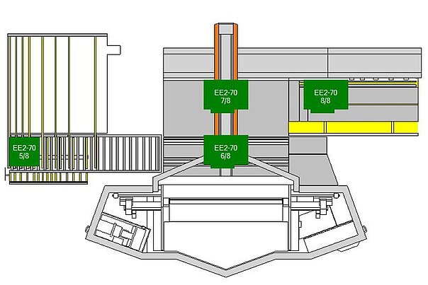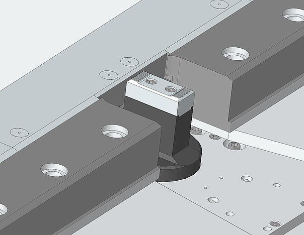 - Die einzeln agierenden Wechselgreifer rasen blitzschnell aufeinander zu, packen die Oberwangen-Werkzeugsegmente und setzen sie exakt auf Position.