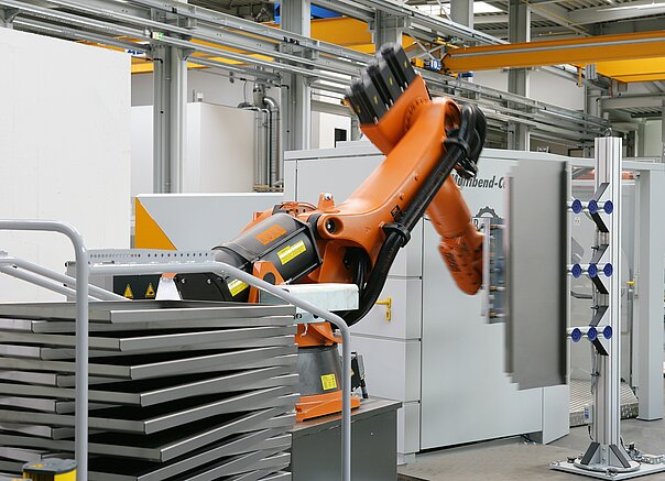 - Der Beladeroboter wendet die Platinen und belädt das Multibend-Center