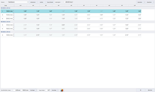 - Hinzufügen von Winkelkorrekturen über Materialtabellen