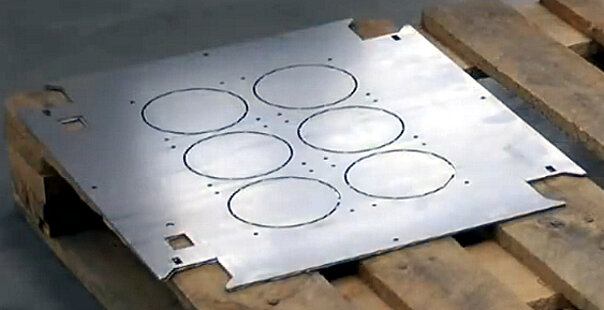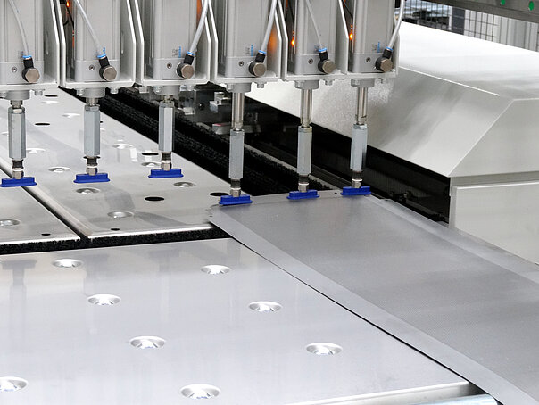 Platinen mit einer geschlossenen Grundfläche belädt der Beladeroboter mit seinem Standard-Saugrahmen. Bei Platinen mit vielen Löchern und Ausschnitte kann der Saugrahmen kein Vakuum erzeugen. In diesem Fall werden optionale Magnete in den Saugrahmen integriert. Damit lässt sich die Anzahl der Biegeteile deutlich erhöhen, die der Beladeroboter der Maschine automatisch zuführen kann.
