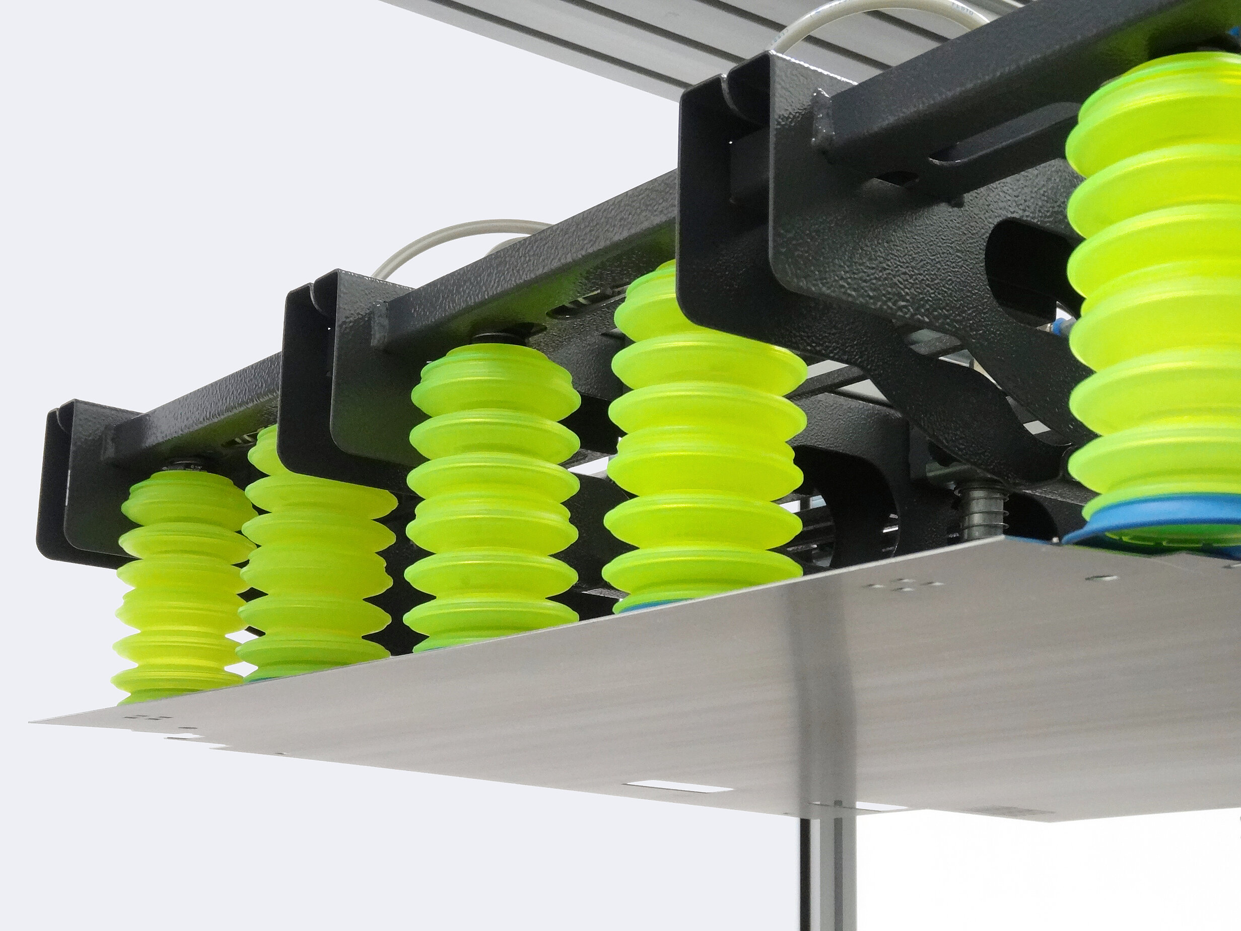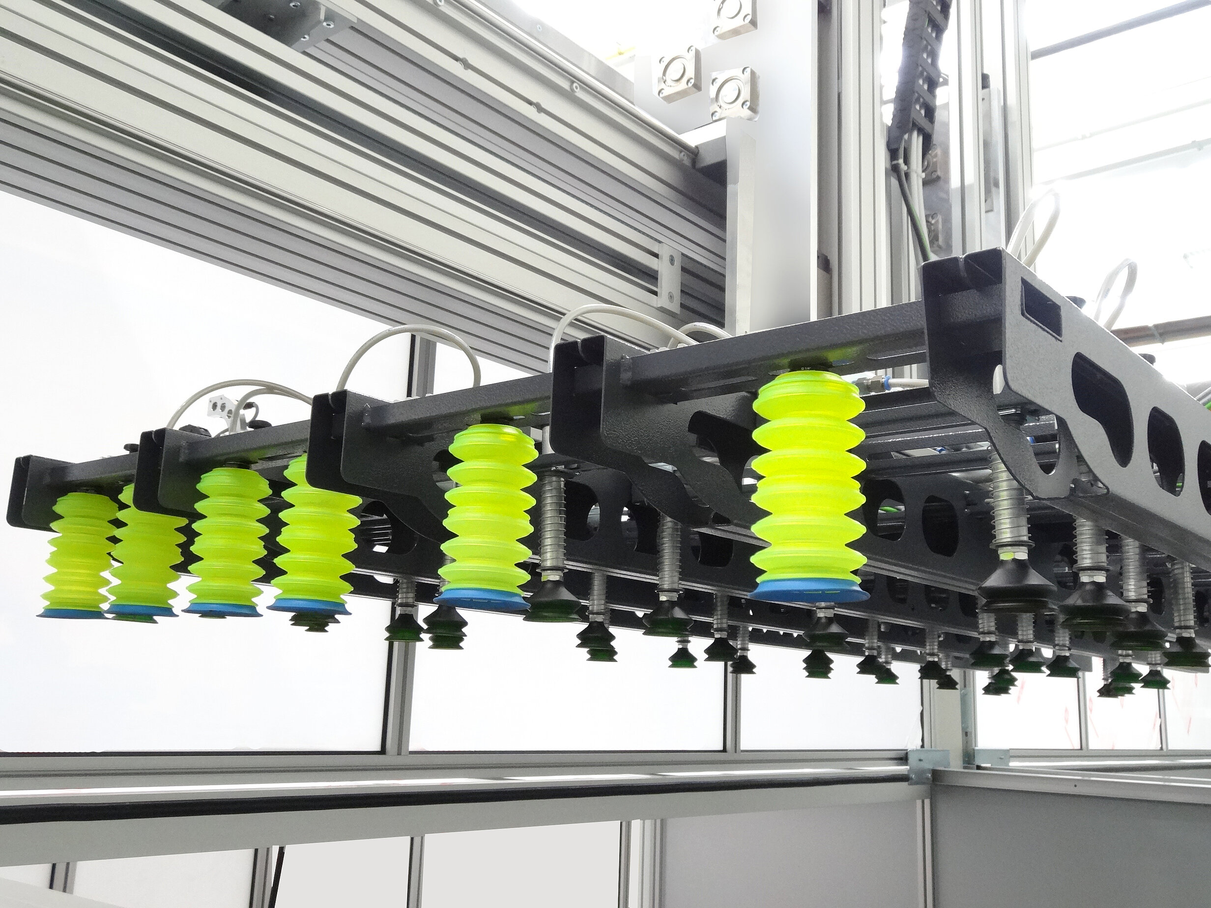Der Saugrahmen ist mit unterschiedlich großen Saugern ausgestattet. Durch die Schnellfixierungen lassen sich die Sauger variabel verschieben und schnell umrüsten.
