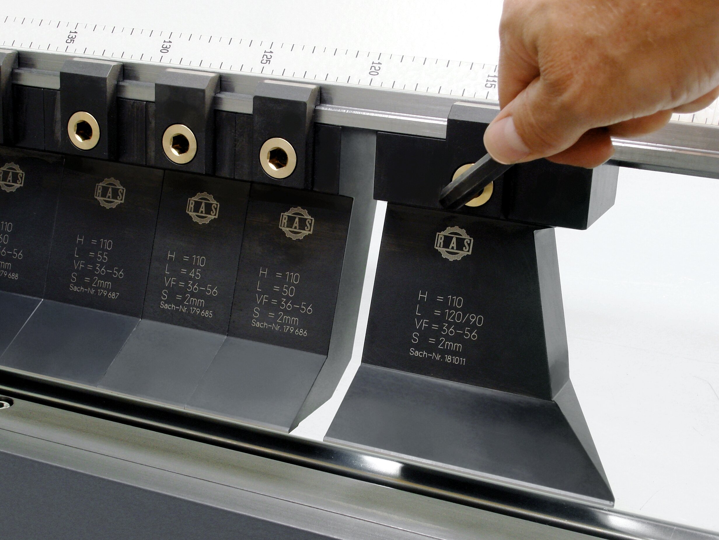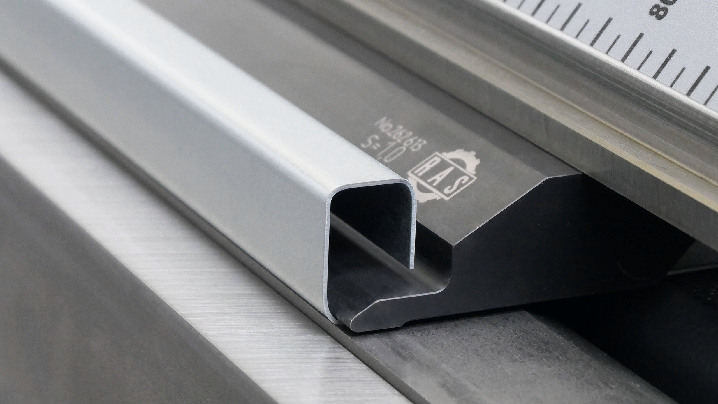 Biegt man nur Profile, reicht ein durchgängiges Spitz- oder Radiuswerkzeug in der Oberwange, um nahezu beliebige Geometrien zu biegen. Bei mehrseitigen Biegeteilen werden zusätzlich segmentierte Werkzeuge benötigt. Ist aufgrund einer speziellen Geometrie dennoch einmal ein Sonderwerkzeug nötig, fertigt RAS spezielle Werkzeuge für die Oberwange und Biegewange nach Kundenwunsch.