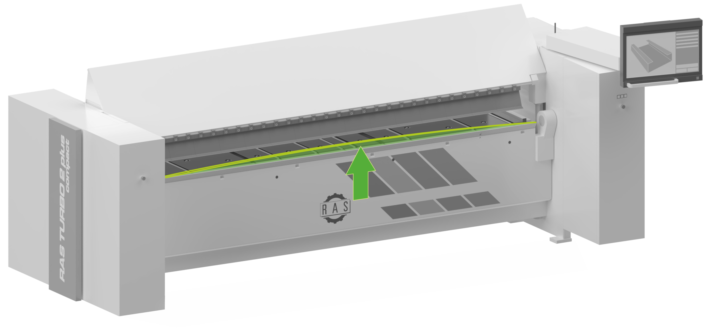 Alternativ zur Maschine mit Standard-Biegewange bietet RAS die TURBO2plus Compact auch mit einem modifizierten Maschinengestell und einer XXL-Biegewange an. Diese bietet einen extragroßen Freibereich an der Biegewange, wodurch zusätzliche Flexibilität bei komplexen Bauteilgeometrien entsteht.
